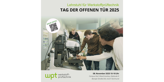 Am Samstag, den 8. November 2025, findet an der Technischen Universität Dortmund der Tag der offenen Tür statt. Zwischen 10:00 und 16:00 Uhr haben interessierte Besucherinnen und Besucher die Möglichkeit, die Universität, ihre Fakultäten und Institute näher kennenzulernen. Der Lehrstuhl für Werkstoffprüftechnik beteiligt sich mit verschiedenen Programmpunkten und lädt alle Interessierten herzlich ein, den Bereich Werkstoffprüfung vor Ort zu entdecken: